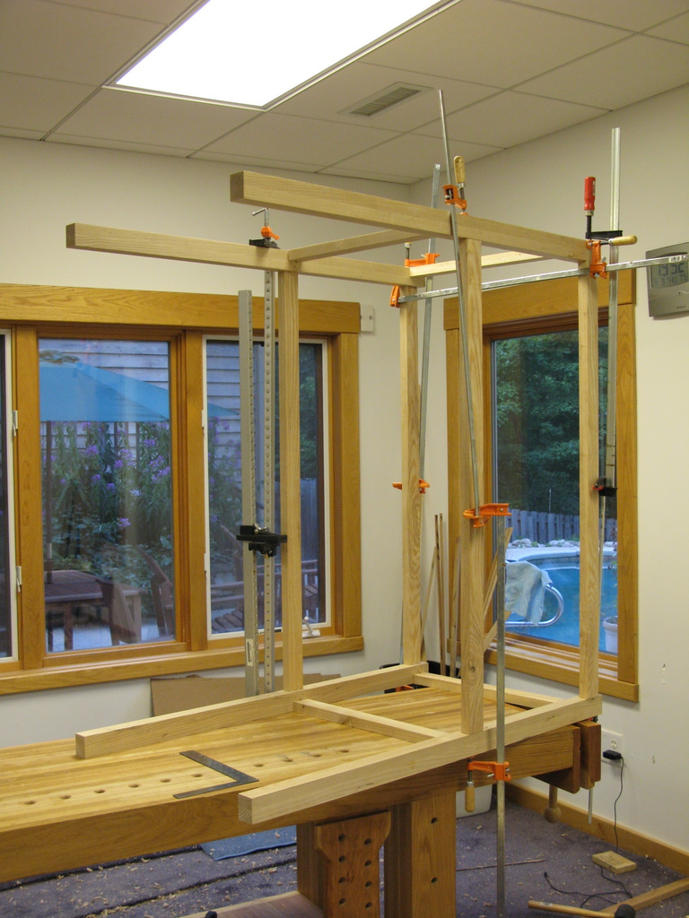 Today I did a glue-up on it. It's really the only large flat surface I have so I put a large sheet of cardboard on top and use it for glueups. However, I hadn't done a few of the tenons right (as usual) and had to stand on the workbench and beat on the table to get it to seat. No problem. At one point I picked up the table and slammed it on the workbench to seat/straighten it. No problem. What a bench!