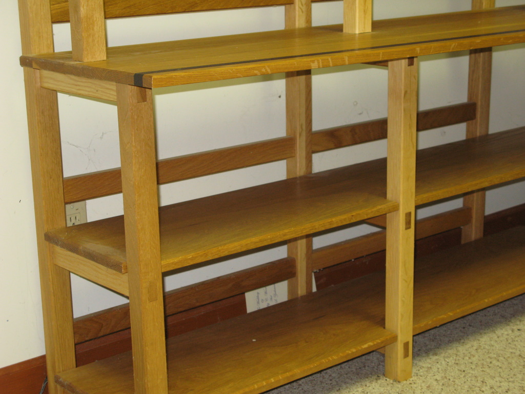 Construction: through-tenon. Oak with wenge detail. The shelves are loose. This is designed for computer work with large bookshelves at the bottom and smaller CD shelves above.