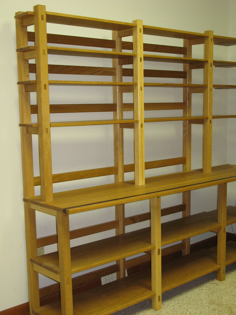 Construction: through-tenon. Oak with wenge detail. The shelves are loose. This is designed for computer work with large bookshelves at the bottom and smaller CD shelves above.